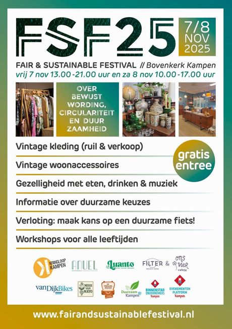Tijdens het Fair & Sustainable Festival 7 en 8 november in Kampen maak je niet alleen kennis met duurzame indicatieven, groene innovaties en inspirerende workshops maar maak je ook kans op geweldige duurzame prijzen!